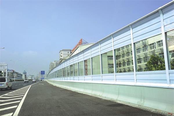 高架橋聲屏障目前常用的是吸聲和隔聲混合型聲屏障,高架橋聲屏障由上下部分金屬百葉吸聲屏、中部透明隔聲共三屏組成,整個屏障呈弧形。